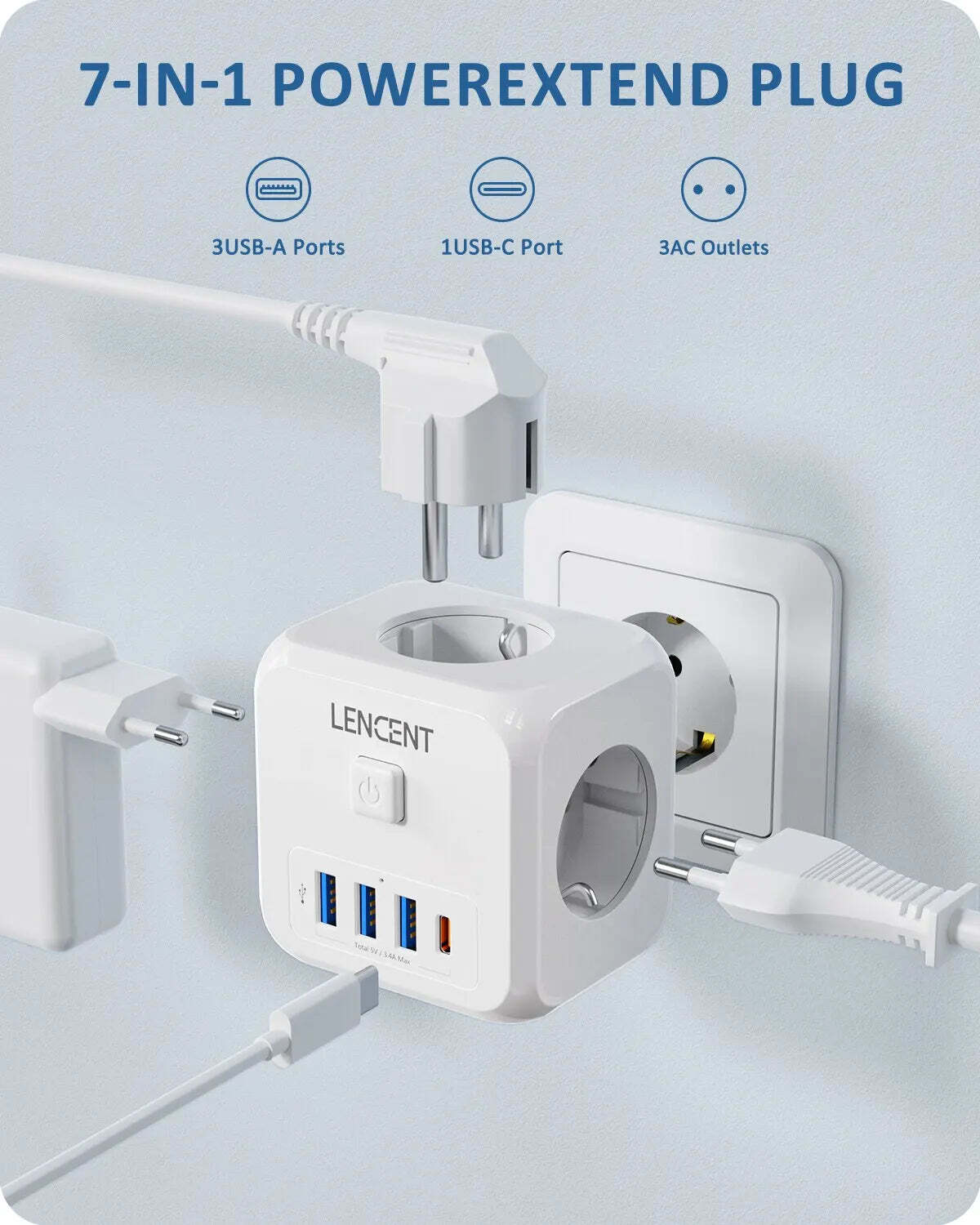 Includes 3 AC outlets + 3 USB ports + 1 Type-C port. The plug features 3 outlets, 3 USB ports, and 1 Type-C port, providing a perfect combination to use multiple devices simultaneously. For example, for computers, mobile phones, tablets, devices with USB ports, etc. The plug is very quiet and noiseless.